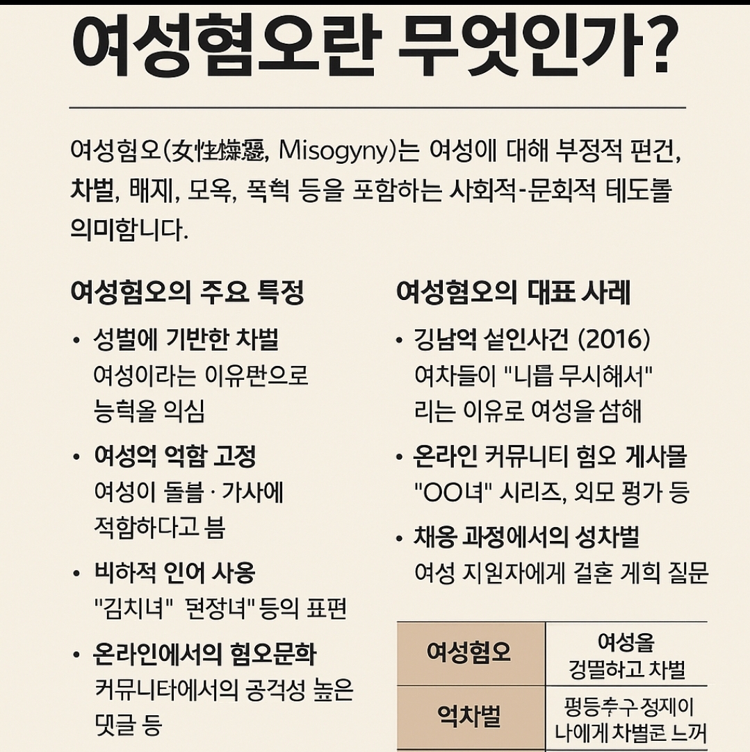 **여성혐오(女性嫌惡, Misogyny)**는 단순한 혐오감을 넘어, 여성에 대한 부정적 편견, 차별, 배제, 모욕, 폭력까지 포함하는 사회적·문화적 태도를 의미합니다.