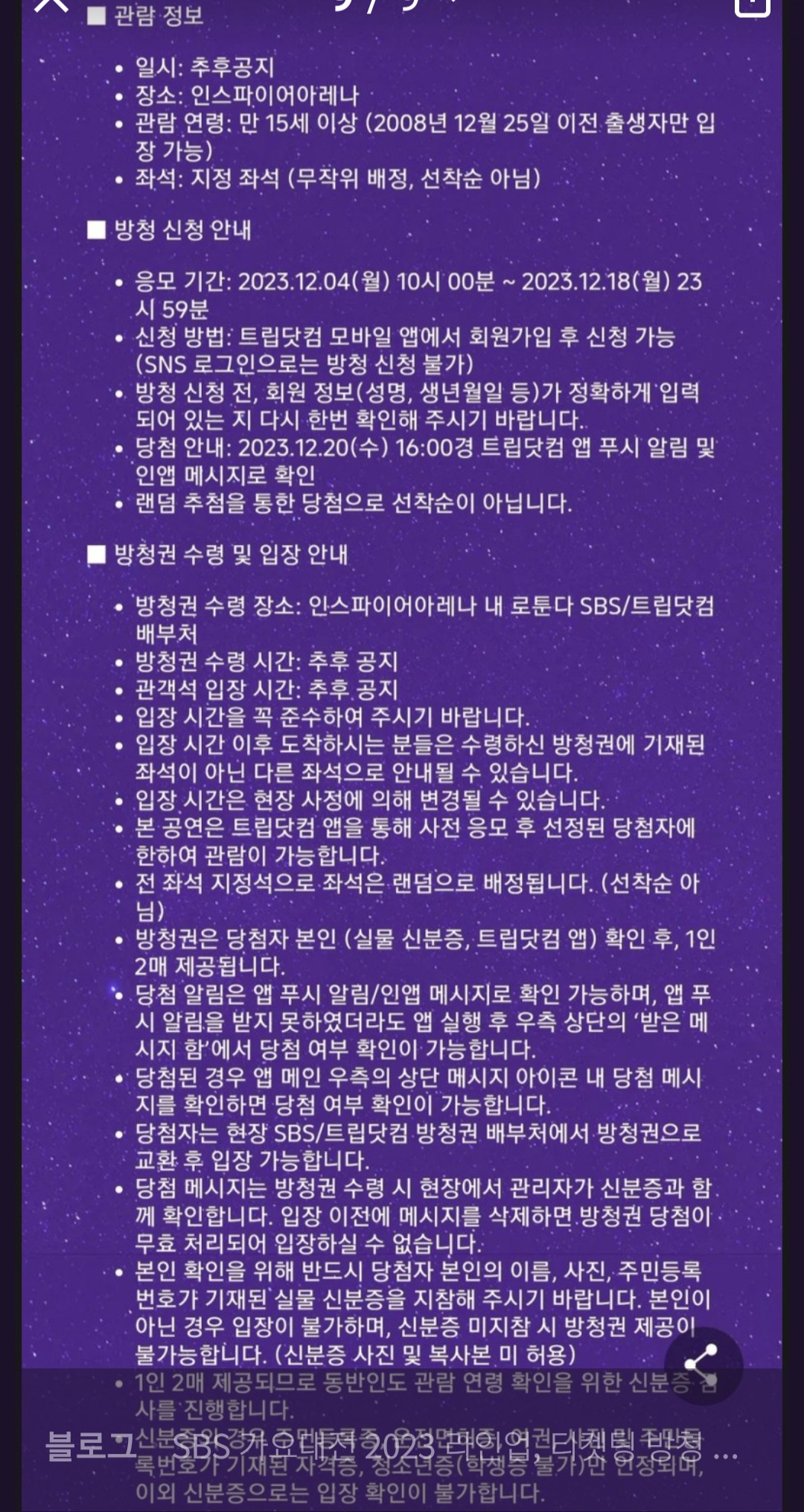 방청권 수령장소는 인스파이어아레나 내 로툰다 SBS 배부처 입니다