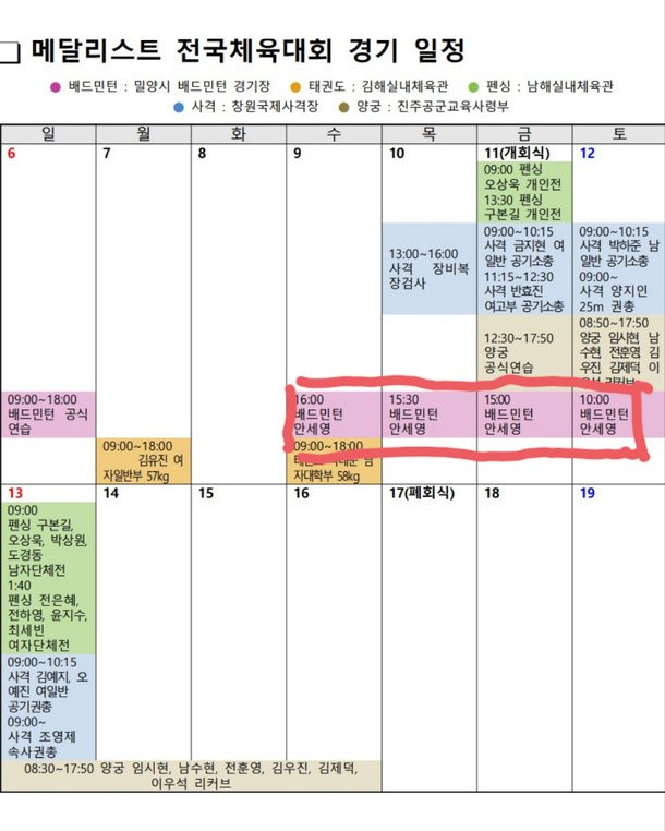 2024년 대회의 세부 일정은 다음과 같습니다. 첫째 날인 10월 11일에는 개막식을 시작으로, 여러 종목이 동시에 치러질 예정입니다. 특히, 배드민턴 종목에서는 안세영 선수의 경기가 기대를 모으고 있으며, 일정은 6:00 PM, 3:30 PM, 3:00 PM에 예정되어 있습니다.