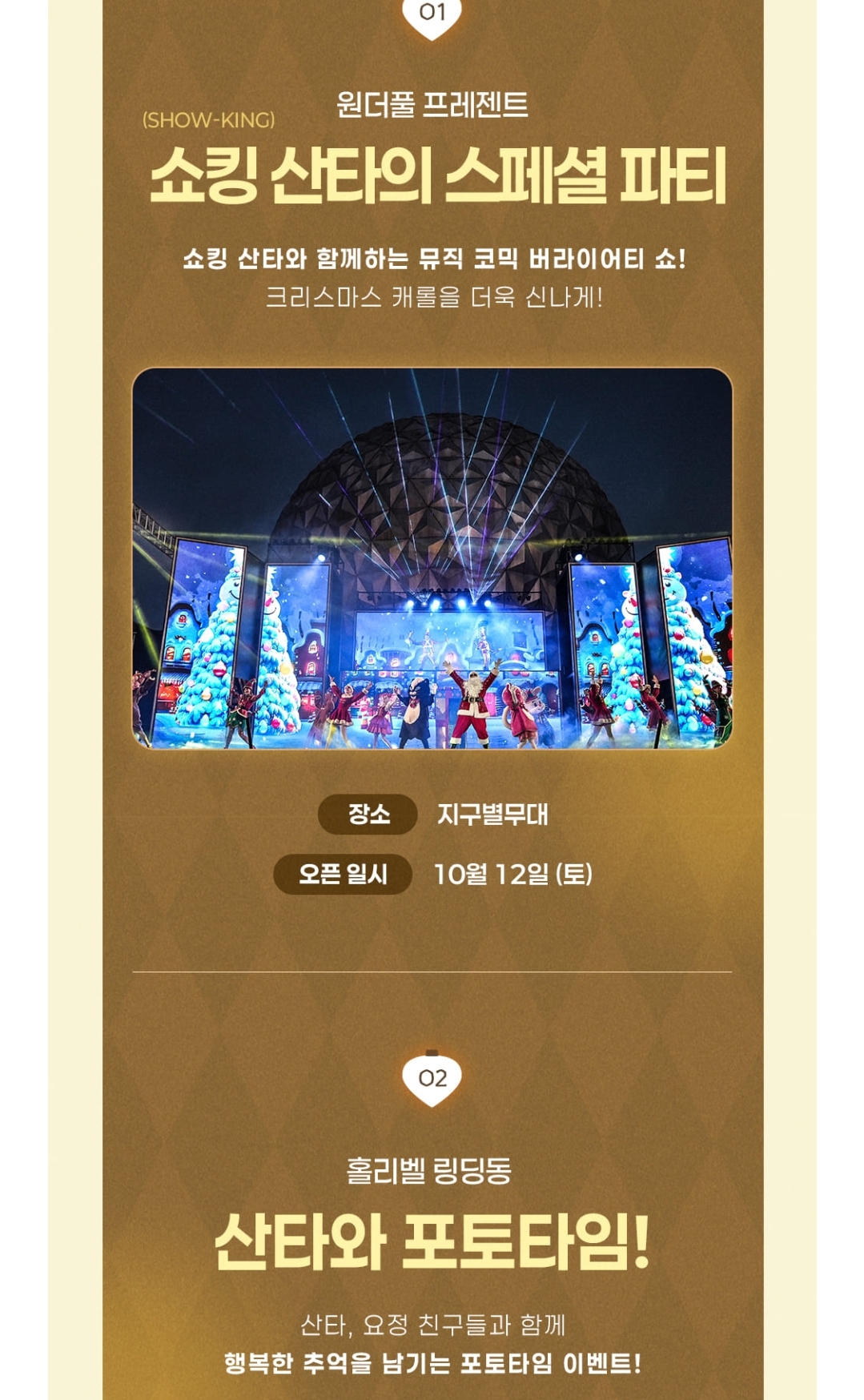 크리스마스의 상징인 산타와 함께하는 포토타임 이벤트도 준비되어 있습니다. 산타와 요정들이 함께하는 이 이벤트에서는 가족, 친구들과 함께 소중한 추억을 남길 수 있는 사진 촬영이 가능합니다. 크리스마스의 따뜻한 분위기 속에서 산타와 기념사진을 찍으며 잊지 못할 순간을 만들어보세요.